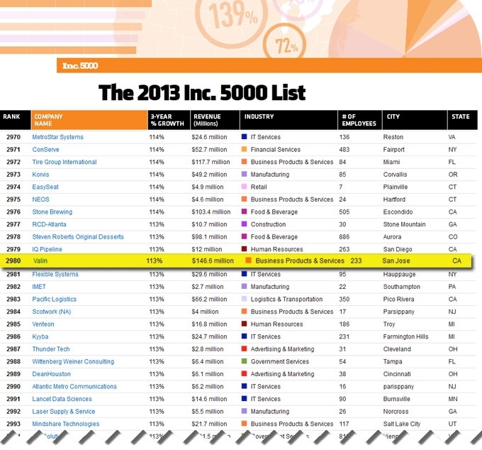 Valin? is featured on the 2013 List ranking 38th among the fastest growing companies in San Jose and 2980th nationally. The list was announced by Inc. for 2013 on August 21st.