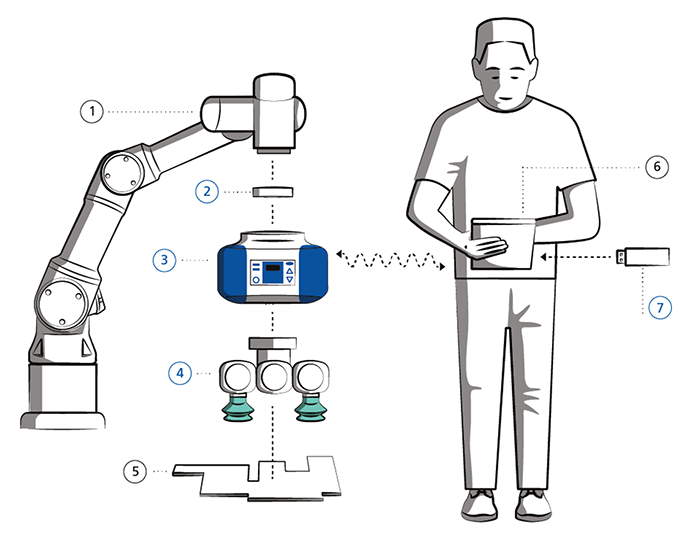 Valin offers vacuum technology that is required for the Cobots and Lightweight Robots. This includes handling sets, vacuum grippers, and vacuum generators. In the illustration here through the Schmalz brand, we can provide all the below parts that are needed for your Robotic arm to function seamlessly.