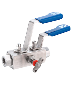 Parkers Hi-Pro series double-block-and-bleed manifold valve with pressures up to 10,000 PSI (689 bar) combines ball type isolate valves and ball or needle type bleed/vent valves into one block for interfacing with pressure measurement transmitters, gauges and switches. Designed to reduce installation costs and improve safety performance, the consolidation of valves into one unit provides the user with a combination of instrument isolation together with bleed/vent and test facilities.