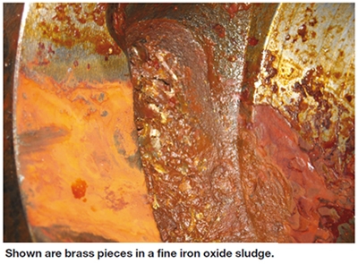 In the particular instance above, the removal of the cast-iron material directly under the brass wear plate has caused the brass wear plate to break away, owing to a lack of supporting material when under mechanical stresses. The relatively large pieces of brass were found mixed in a fine iron oxide sludge in the bottom of the pump housing, as would be expected for this type of corrosion.