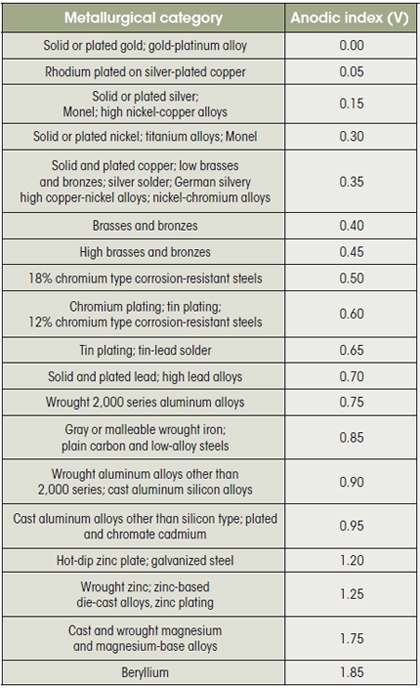 Metals contain thermodynamic energy—positive and negative charges—that are released by the process of corrosion. Metals are rated in their ability to resist electrochemical corrosion on the scale of nobility and on the galvanic series chart, which shows their electrical potential in seawater. More noble metals (such as gold, silver, and titanium) have a neutral or negative electrical potential, so they will not generate a flow of positive ions. At the other end of the scale, more active metals (zinc, aluminum, and cast iron) exhibit strong positive charges that tend to generate electrical current.