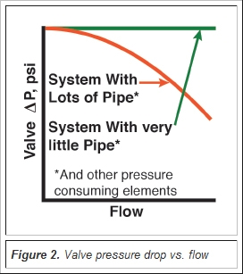 The majority of fluid process systems include a significant amount of pipe and other pressure-consuming elements (elbows, pipe reducers, isolation valves, heat exchangers, pumps whose pressure decreases with increasing flow, etc.). This results in a relationship between system flow and pressure differential available to the control valve similar to the lower curve of Figure 2.