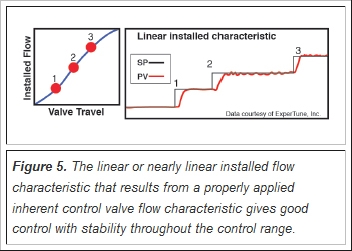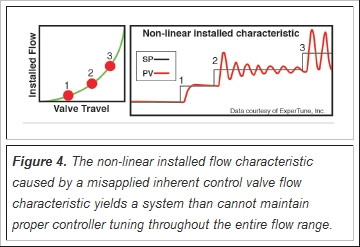 The symptom of a misapplied control valve flow characteristic is a control loop that only gives good control at one end of its operating range and is either sluggish or becomes unstable at the other end of its operating range. An example of a misapplied valve inherent flow characteristic would be an equal percentage valve in a system with very little piping. The left-hand graph of Figure 4 shows the resulting non-linear (equal percentage) installed flow characteristic, which is very undesirable.