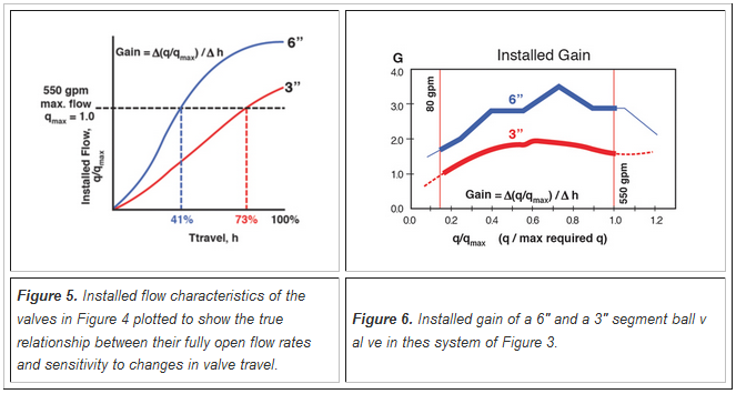 Figure 4 shows the installed flow characteristics of two valves being considered for the application, a 6" segment ball valve and a 3" segment ball valve. Emphasis has been added to the portions of the installed flow graphs that are within the specified flow range of 80 to 550 gallons per minute. Because segment ball valves have an inherent equal percentage flow characteristic and because the system is one where valve pressure drop decreases with increasing flow, it is not surprising that the installed flow characteristics are very nearly linear (especially within the specified flow range). This computer-generated graph shows how linear the installed characteristics are and how much safety factor is at each end of the required flow range. However, because the vertical scale is normalized to show actual flow divided by the fully open flow for each valve when comparing several valves for the same application, one cannot see the differences in the steepness (slope) of the graph and thus the sensitivity to changes in valve position. If the data in Figure 4 were plotted on a GPM scale, instead of flow divided by fully open flow, it would look like Figure 5 where the relative steepness of different valves can be clearly seen. The program uses a graph like Figure 5, where the gain is calculated based on the maximum required flow, qmax, that is Gain = Δ(q/qmax) / h. Note that this graph on a GPM scale is not visible to the user.