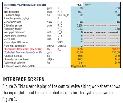 Figure 2 is a screenshot of the user interface of the worksheet showing the process data for the example in Figure 1. It also shows the calculated required valve Cv for both the minimum and maximum specified flow.