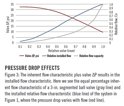 When an equal percentage valve is installed in a system where, due to reassure losses, not only is the shape of the relationship between valve travel and flow changed, but the fully open valve flow capacity is significantly reduced. This can occur due to pressure losses in system piping and other pressure consuming components such as elbows, isolations valves, heat exchangers, etc.
