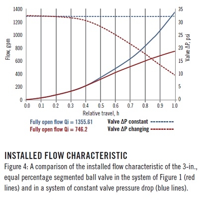 In Figure 4, I've clarified what's really going on when an equal percentage valve is installed in a system where valve pressure drop decreases with valve opening and increasing flow.