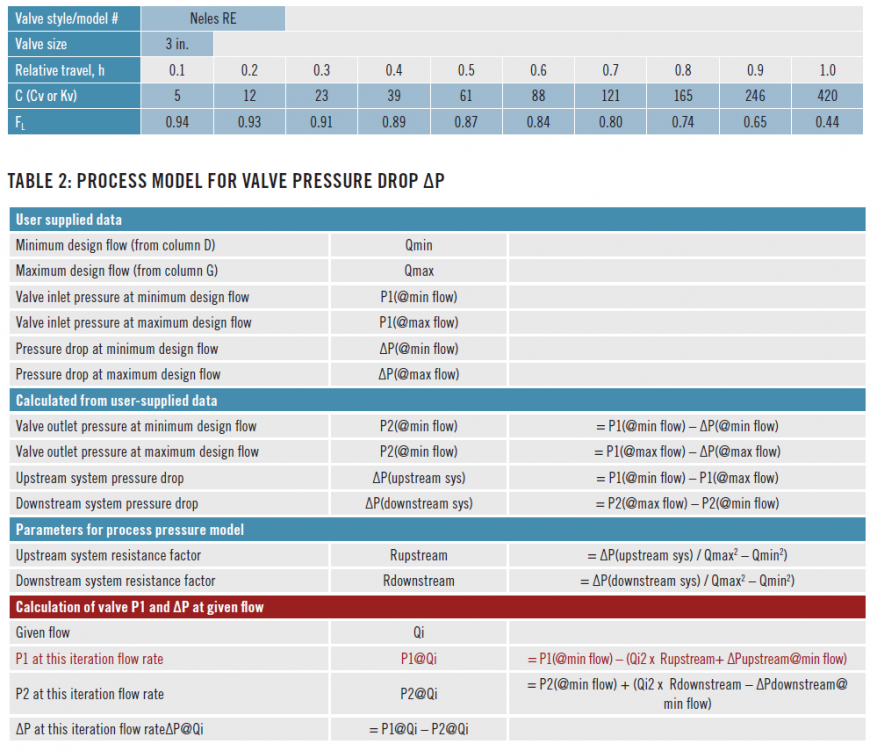 I also constructed a control valve sizing worksheet that can graph the installed flow characteristic of a given valve in the system where it will be installed. The installed flow graph is based on the valve manufacturer's tabulated values of Cv vs. relative travel (Table 1), the user's input of process flow conditions, such as those tabulated in Figure 1, and a process model based on the principle that the pressure losses in a piping system are approximately equal to flow squared. The process model and how it's applied are shown in Table 2.