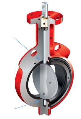 With regard to the seating design, the rubber lined valve stem and disc is centrally located in the body. This means that the disc is in constant contact with the rubber liner at the 12:00 and 6:00 positions. When the disc is in the open position for extended periods of time, the rubber liner takes a set at the point where the disc is positioned. That slight indentation becomes a leak path when the valve is closed. There are a few degrees where the disc is continuously in contact with the boot that are wear points if the valve is operated frequently. Arrows depict the contact points in the rendering.