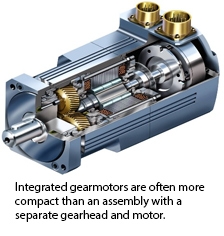 Integrated Gearmotors: This is the best choice for certain applications. One advantage is that the overall length of the assembly can be considerably shorter than an assembly with a separate gearhead and motor. System design is also simpler because only one speed and torque curve is needed to determine if a gearmotor will provide the necessary performance to power the motion control system.