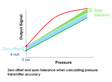 Span tolerance is the deviation of the actual span from the ideal span between the zero point and the full-scale point. The span offset is not related to the zero offset and has to be added to it.