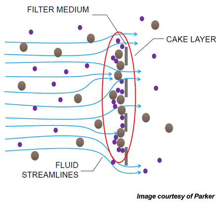 A filters efficiency will also increase as the filter develops a cake. The cake will decrease the permeability of the media increasing the filters efficiency. This can also explain why the performance of a filter can exceed its given micron rating that is based on the performance of a clean element tested under laboratory conditions. It can also be why test figures for identical elements can differ with different application conditions.